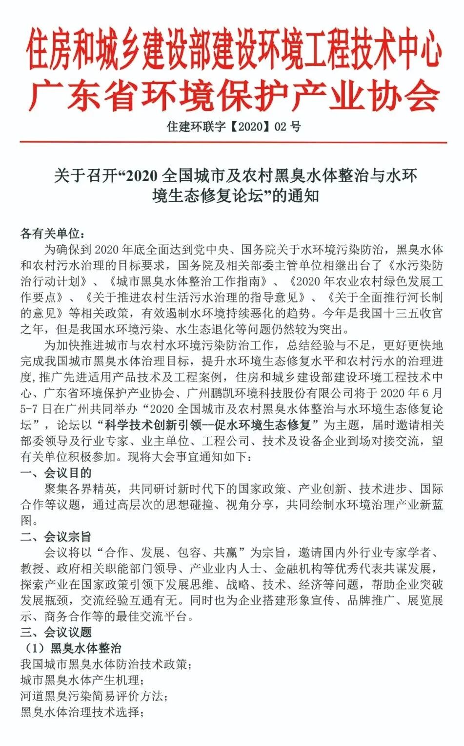 为加快推进城市与农村水环境污染防治工作,总结经验与不足,更好更快地完成我国城市黑臭水体治理目标,提升水环境生态修复水平和农村污水的治理进度,推广先进适用产品技术及工程案例,住房和城乡建设部建设环境工程技术中心、广州鹏凯环境科技股份有限公司将于2020年8月21-23日在广州共同举办“2020全国城市及农村黑臭水体整治与水环境生态修复论坛”,论坛以“科学技术创新引领--促水环境生态修复”为主题,届时邀请相关部委领导及行业专家、业主单位、工程公司、技术及设备企业到场对接交流。